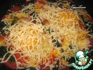 Немного сдвинуть содержимое сковороды на края и вбить яйца. Посолить, поперчить и посыпать тертым сыром.