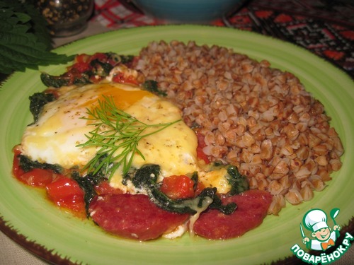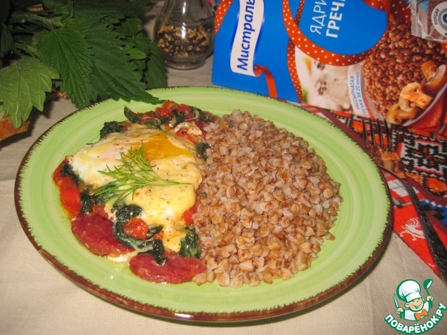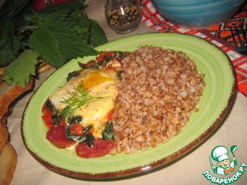 Яичницу с мясокопченостями, томатами, крапивой и сыром я подавала с рассыпчатой гречневой кашей.
