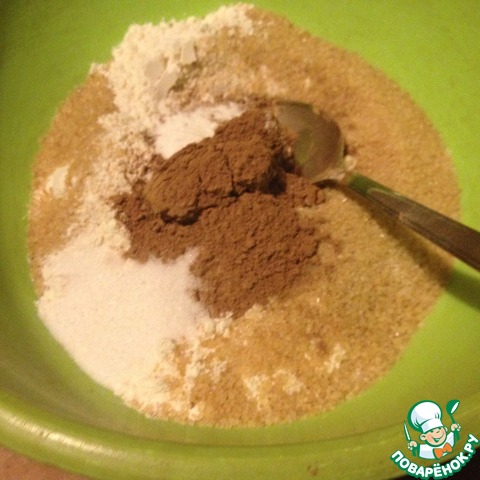 Смешать сахар, соль, соду, ванильный сахар, муку и какао.
