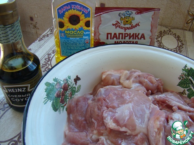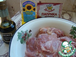 К курице добавить паприку, соевый соус и не жалея подсолнечное масло. Хорошо помять курочку, она должна быть полностью покрыта маслом.
