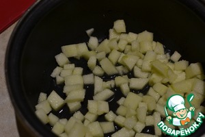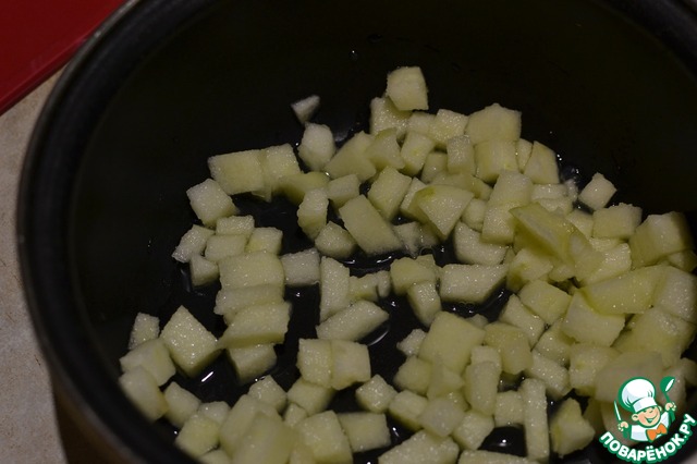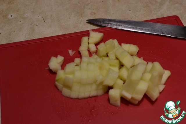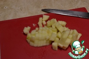 Ставим кипятиться воду и варим рис. Одновременно готовим вкусные добавки к рису. Яблоко чистим от сердцевинки и кожицы, режем на мелкие кубики.