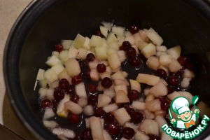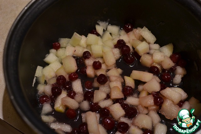 Добавляем в яблоки бруснику, сахар и прогреваем 1-2 минуты.