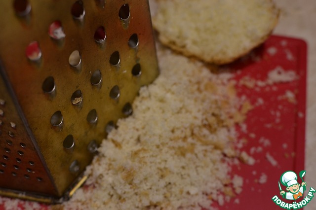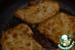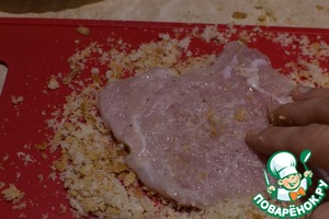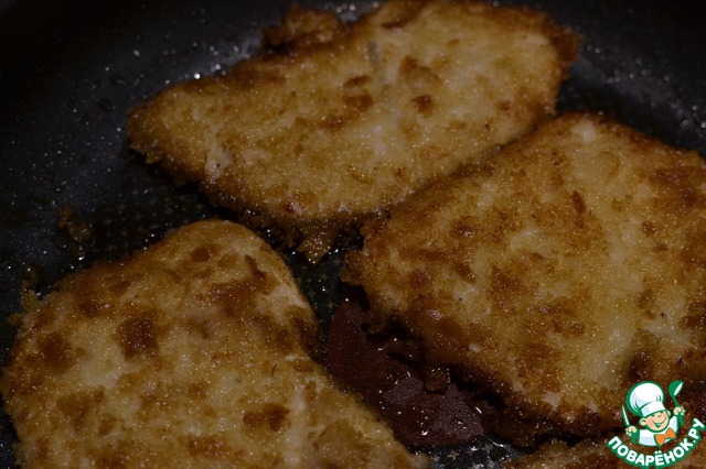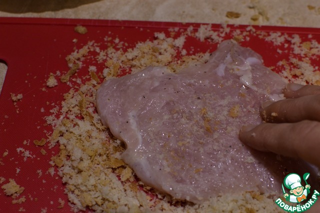 Слега отбиваем маринованное филе и тщательно обваливаем в хлебных крошках, прижимая как следует.