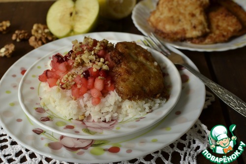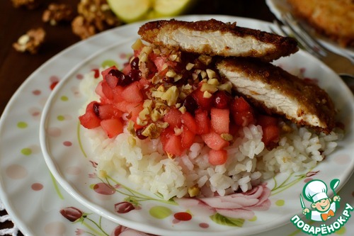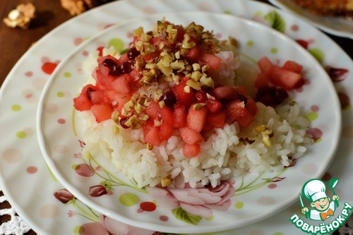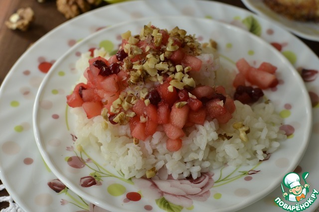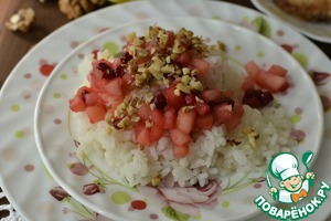 Выкладываем рис, яблоки с брусникой, посыпаем рублеными орехами.
