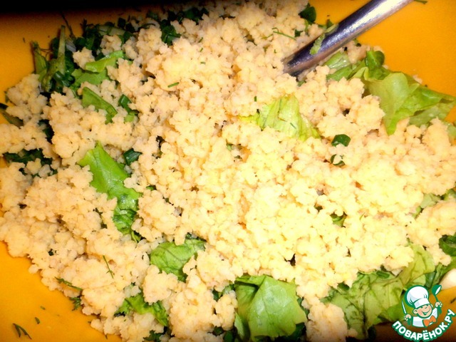 Пшено достать из кипятка, дать стечь воде, разрезать и разложить тонким слоем на остуженной в морозилке тарелке, дать остыть 1 минуту и выложить в салатницу к овощам.