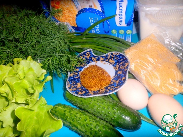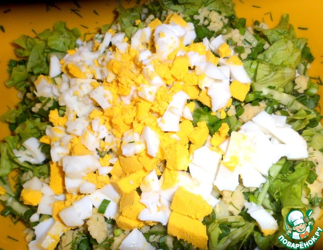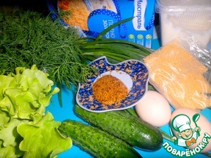 Нарвать листья салата, нарезать огурцы, укроп, зеленый лук. -