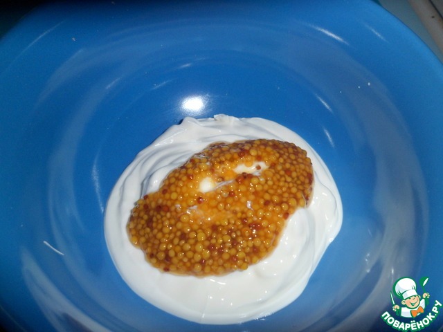 Затем добавить перемешанную сметану с горчицей, если нужно, посолить и поперчить по-вкусу.