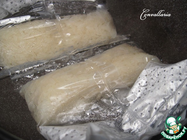 Воду довести до кипения, добавить немного соли и выложить пару пакетиков риса. Варить согласно инструкции на упаковке - 30 минут.