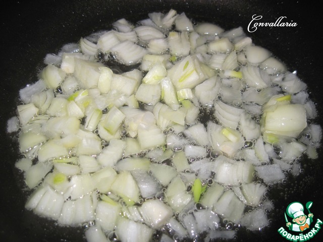 Нагреть в сковороде растительное масло, выложить мелко нарезанный лук. Помешивая, обжарить на среднем огне в течение 2-3 минут.