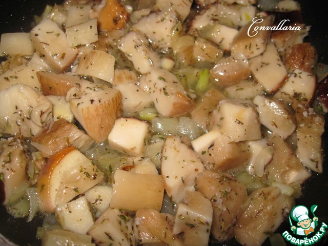 Добавить нарезанные грибы, посыпать тимьяном, немного посолить и обжарить грибы под закрытой крышкой минут 10.