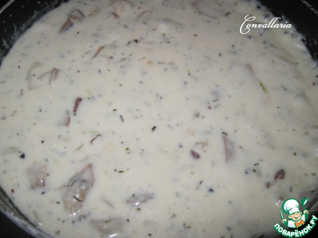 Затем посыпать мукой, хорошо перемешать, чтобы не было комочков, и влить 200 мл сливок. Не переставая помешивать, готовить до загустения (примерно пару минут).
