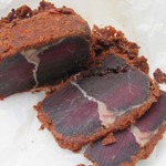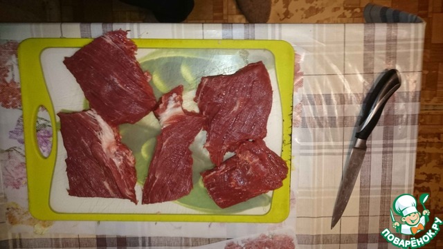 На рынке бастурму продают целым куском. Я делаю бастурму дома и поэтому разрезаю вырезку вдоль по волокнам и на 3-4 части, в зависимости от величины. Мельчить не нужно - пересохнет и станет слишком твердой.