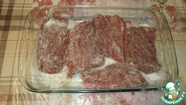 Берем подходящую емкость (лучше стекло), натираем мясо крупной солью, смешанной с нитритной (убивает паразитов). (Нитритную соль покупаю в интернете.)