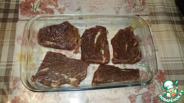 Каждый вечер достаем, сливаем образовавшийся сок, переворачиваем куски - и обратно в холодильник. -