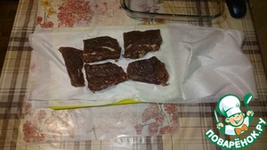 Перед обмазкой приготовьте палочку, на которой будет висеть мясо. Аккуратно обмазываем каждый кусок со всех сторон (я использую для "покраски" силиконовую кисточку).