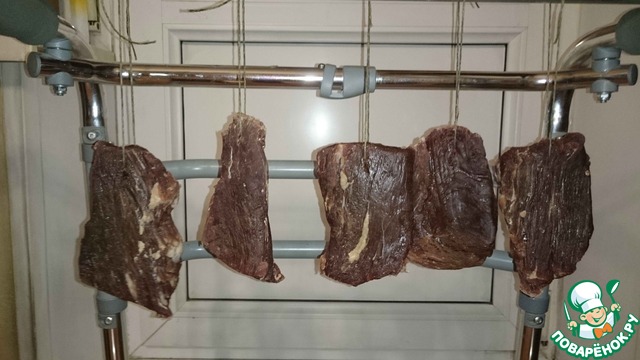 Подвешиваем говядину на сутки на балконе, или, как у меня сейчас, просто в комнате. Летом лучше прикрыть марлей.