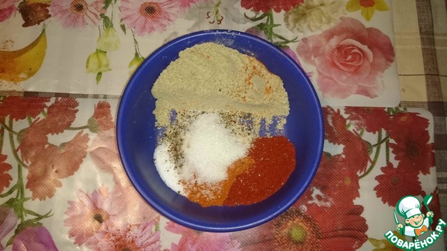 (Я иногда добавляю немного соли и обычно смесь перцев. Во многих рецептах пишут, что мясо после засолки нужно промывать. Я так не делаю, поэтому соли в обмазку добавляю очень немного.) -