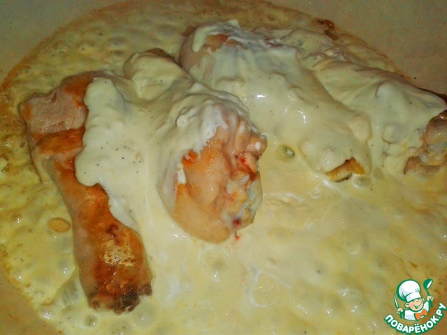 Обжариваем курицу 15 минут, постоянно переворачиваем голени на сковородке. -