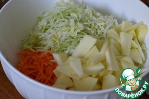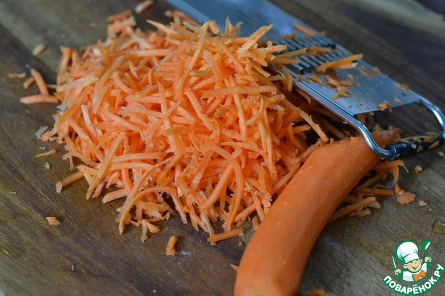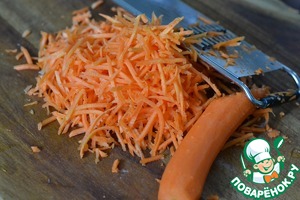 Морковь натереть на терке (для корейской моркови) или тоненько нарезать. Выкладываем к капусте