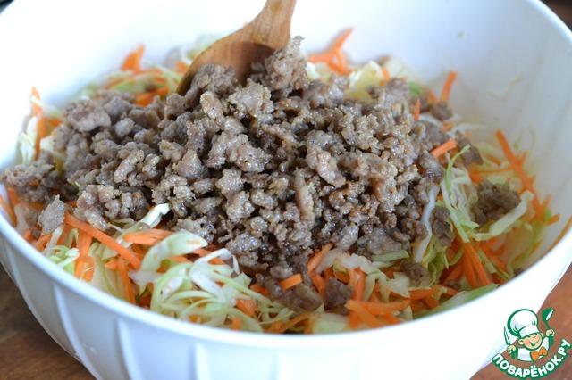Добавить к овощам обжаренный фарш.