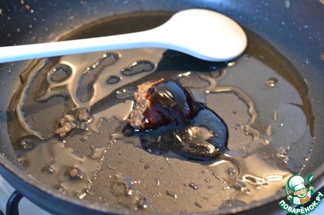 Сковородку вернуть на огонь и к жиру, что остался от обжарки мяса, добавить горчицу, бальзамик, чили-пасту и лимонный сок.