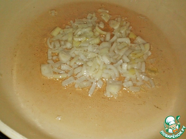Мы нарезаем лук и выкладываем на разогретую сковородку для обжаривания.