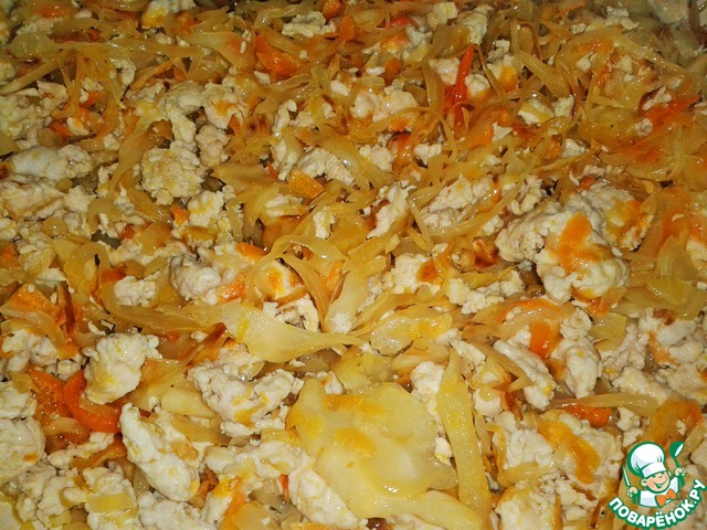 Добавляем куриный фарш, тушим еще минут 10. Перемешиваем.