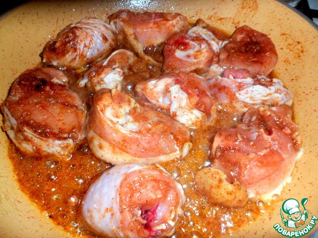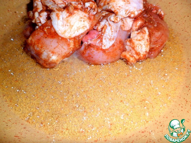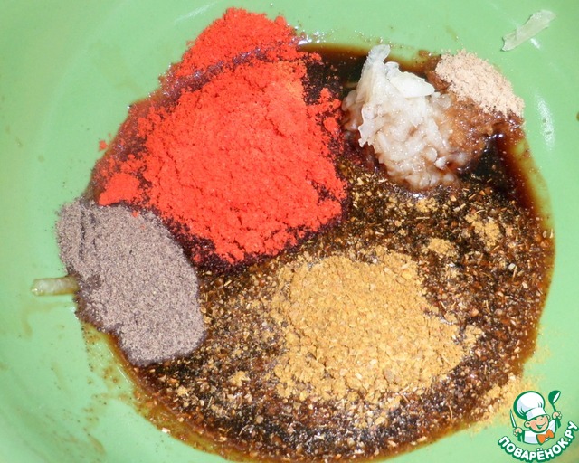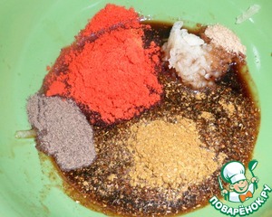 Смешать- соевый соус, паприку, давленный чеснок, молотый сухой имбирь, карри, перец. -