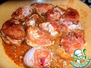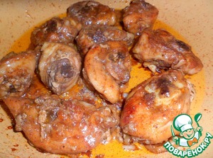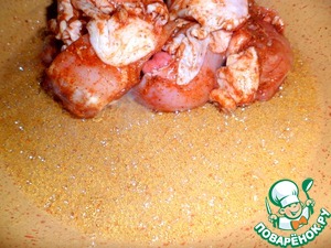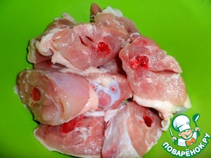Можно взять любые части курицы, у меня окорочка. Нарезать их небольшими кусочками, соединить с маринадом.