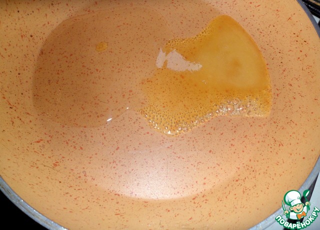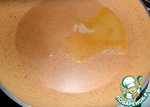 Разогреть чуть сковороду, налить растительное масло 0,5 ст. л., добавить мед.