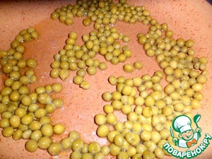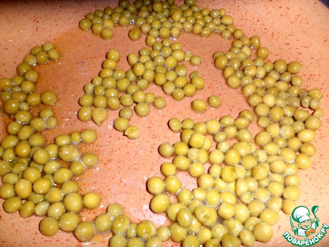 Пока доходят до готовности окорочка, на слегка разогретую сковороду выложить масло топленое ( можно взять и сливочное - 2 ст. л.) и зеленый горошек.