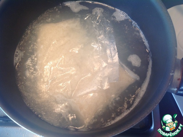 • В кастрюлю с кипящим куриным бульоном или водой добавить рис в пакетиках, чуть посолить и варить 30 минут. У меня рис в пакетах ТМ Мистраль "Янтарь".