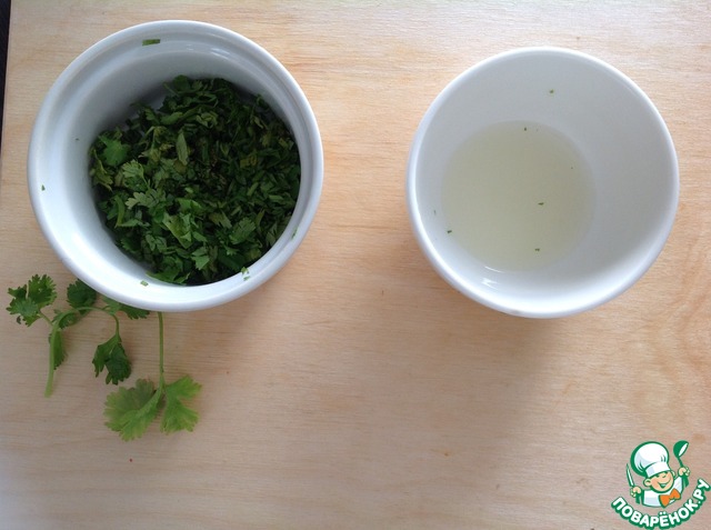 • Кинзу сполоснуть, обсушить и мелко нарезать. С половины лайма при помощи терки снять цедру и выжать сок. Если лайм мелкий, то использовать весь плод.
