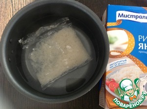 В кастрюлю для варки риса налить воду, поставить на огонь и довести до кипения. В кипящую воду добавить необходимое количество риса в пакетиках, варить 30 минут до готовности. Я использовала рис ТМ Мистраль "Янтарь".