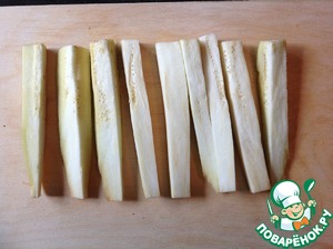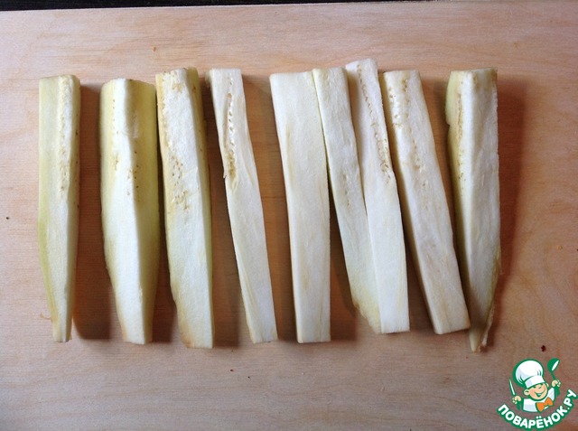 Баклажан очистить от кожуры, нарезать на бруски и замочить в воде в течение 5 минут.