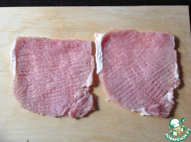 Свинину нарезать поперек волокон тонкими ломтиками, отбить.