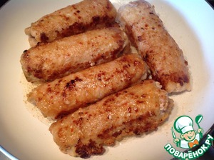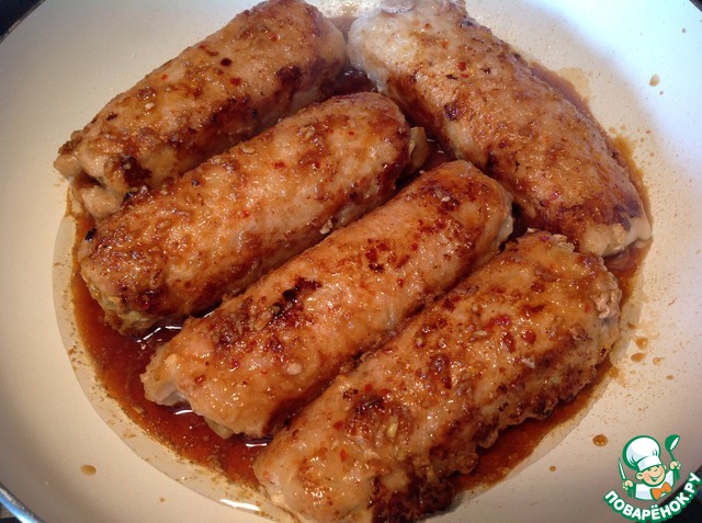 Вылить заправку в сковороду на рулеты. Вращая свиные рулетики, жарить еще 2-3 минуты. Затем свиные рулетики выложить на блюдо.