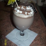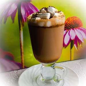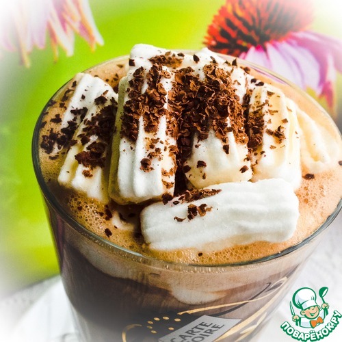 В бокал налить горячий шоколад, сверху выложить маршмеллоу. Украсить молочным шоколадом.