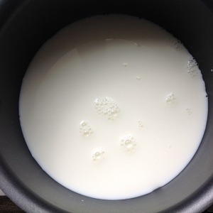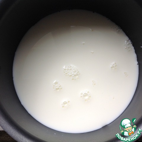 В сотейник налить молоко, довести до кипения, снять с огня. Для получения сливочного вкуса молоко можно заменить десятипроцентными сливками.