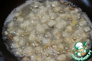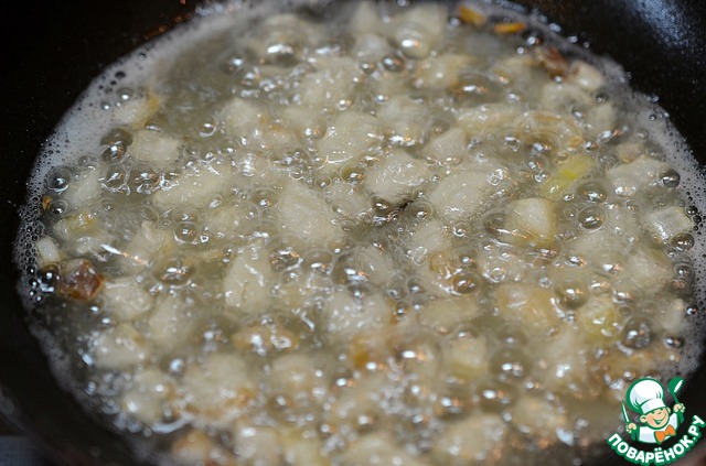 В эту же сковороду добавим масло и обжарим лук до золотистого цвета.
