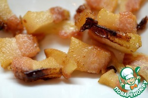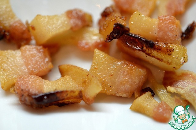 Бекон нарежем кубиком. Обжарим бекон до хрустящего состояния.