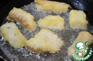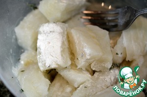 Обваливаем кусочки рыбы в муке или панировочных сухарях, смешанных с солью.