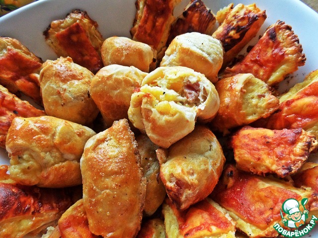 Просто раскатать 2 пласта слоёного теста, между ними тёртый сыр с яйцом, сверху томатная паста. Часть слоек с беконом - мужской вариант)))