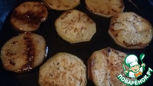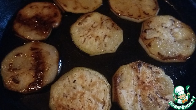 Серединку баклажана порезать кружочками и поджарить на растительном масле. В процессе обжарки посолить с 2-х сторон. Выложить на бумажные полотенца, чтобы избавиться от лишнего масла. Кончики баклажана нарезать небольшими продолговатыми кусочками и тоже обжарить.