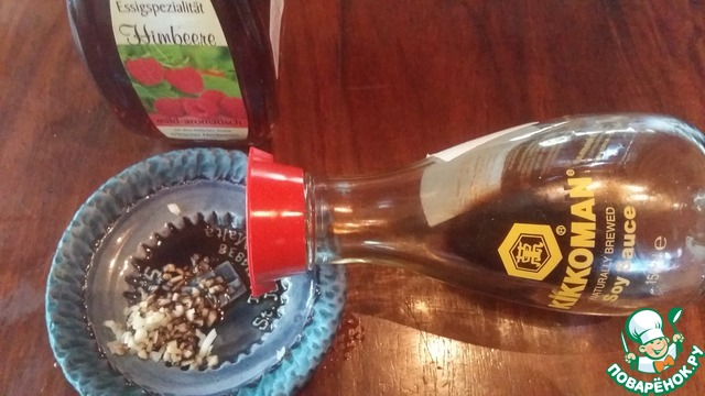 Чеснок измельчить. Один зубчик смешать с соевым соусом и малиновым уксусом.
