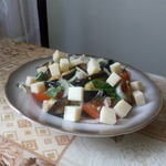 Помидор нарезаем на слайсы, сыр небольшими кубиками. В оригинале используется имеретинский сыр, но можно заменить на мягкие сыры с нейтральный вкусом, такими как моцарелла или несоленая брынза, или фета. -