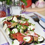 На тарелку выкладываем баклажаны с зеленью, сверху пластины помидора и опять баклажаны. Сверху присыпаем сыром и подаем к столу.