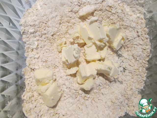 В миске смешиваем овсянку, муку, соль и перец. Добавляем сливочное масло. порезанное кубиками, перетираем в крошку.