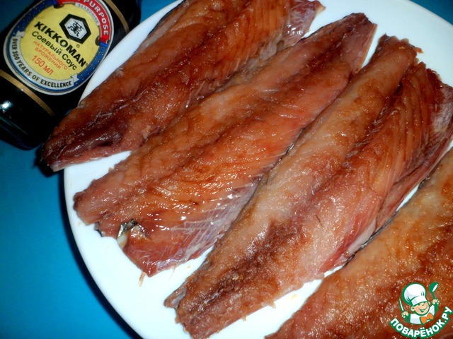 • Рыбу тщательно смазать соевым соусом. На этой стадии посыпать черным молотым перцем. Я не посыпала, рыбу давали детям. Но перчик здесь очень нужен.