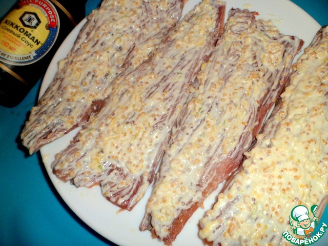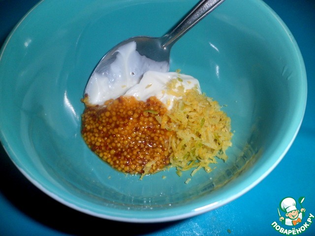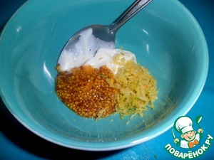 • Приготовить смесь для намазки рыбы, смешать - майонез, горчицу, цедру лимона.